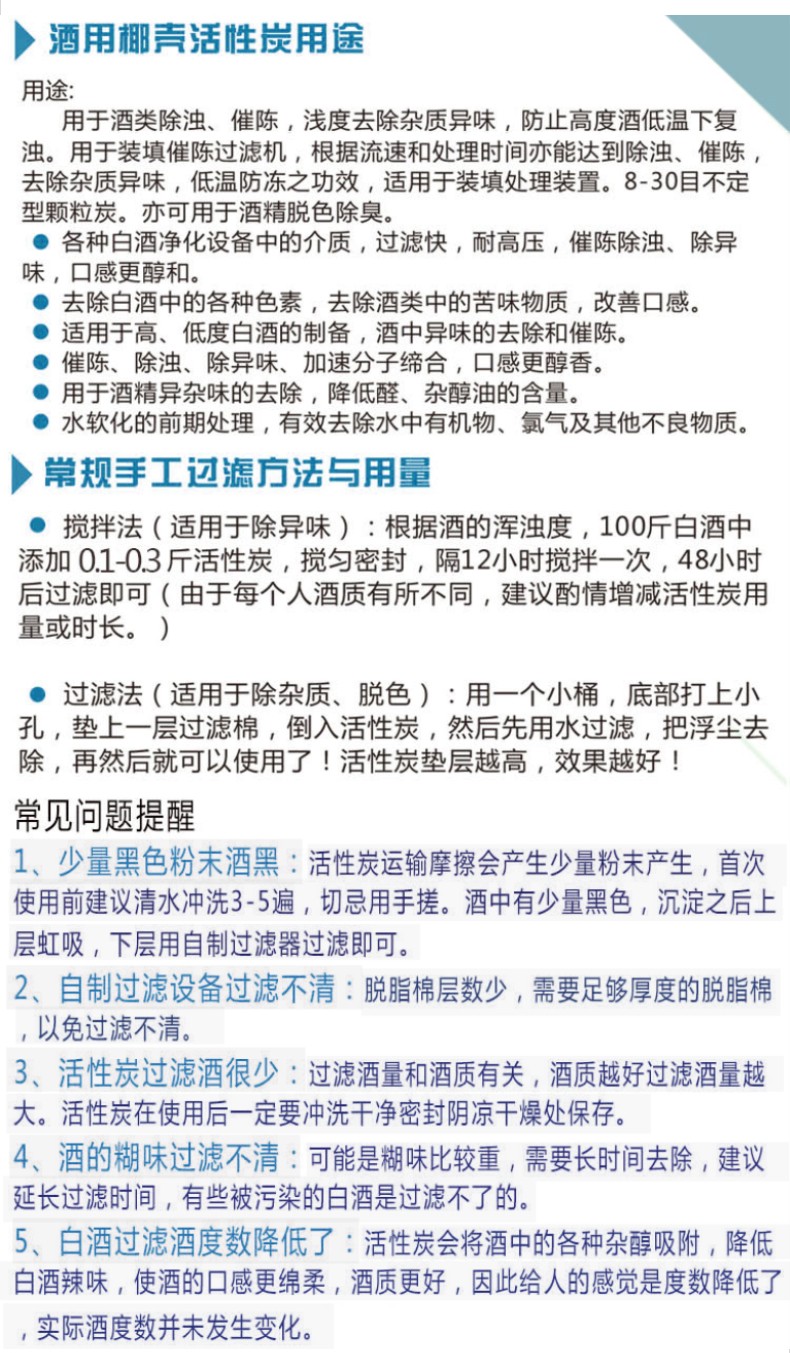 酒用活性炭廣泛用于白酒提純去異味、葡萄酒脫色除異味及啤酒提純去異味。但是,活性炭是不可以長期放在酒中的,用時和用量都需要根據不同的酒類來適量運用。例如,經測定己酸乙酯直徑是1.44mm時,選用1.4mm-2mm的活性炭除低度酒的渾濁物,則己酯就會入微孔而被吸附,使低度酒受損,只有選用孔徑大于2.0mm的活性炭,其微孔成為己酯的通道炭不會吸附己酯,才能達到工藝要求,除濁并保質。