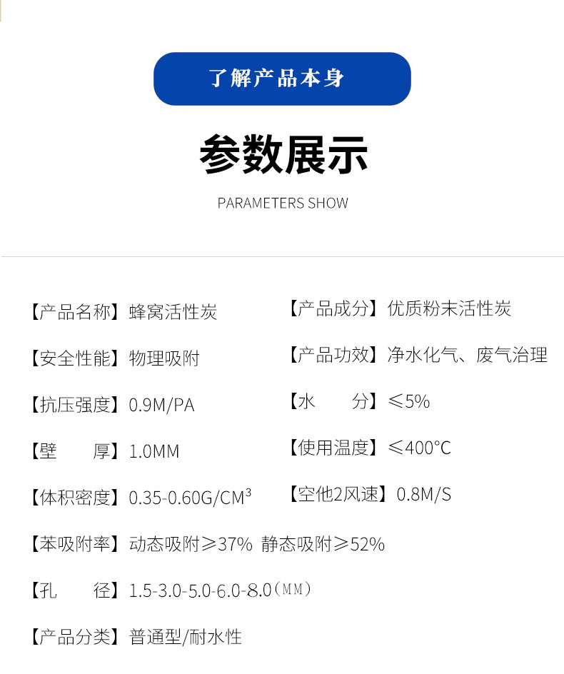 蜂窩活性炭是一種環保活性炭,以煤質、木質碳粉為原料,經蜂模具擠壓成型,晾曬后高溫活化燒制而成,能降低異味和污染物,主要分為兩種,防水型和普通型。防水型蜂窩活性炭強度更高,在廢氣吸附方面使用范圍更廣,不易碎,不坍塌,不自燃,燃點高于400℃,遇水不化。蜂窩活性炭外觀規整,通過性強,阻力小,碘值高,吸附能力強,使用壽命長,更換周期久,易更換;每立方可吸附廢氣量高達120公斤,可脫附再生,循環使用。蜂窩活性炭能有效降低異味和污染物,到廢氣排放標準。廣泛用于工業廢氣處理,催化燃燒,VOCS處理,噴漆房除味等吸附凈化領域。