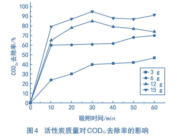 在染料廢水中,分別加入不同質(zhì)量的顆粒狀活性炭,在常溫條件下吸附,測(cè)定不同吸附時(shí)間的CODcr去除率,結(jié)果如圖4所示。